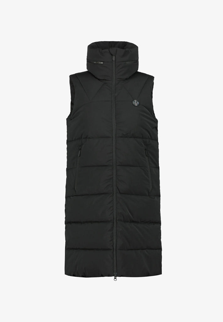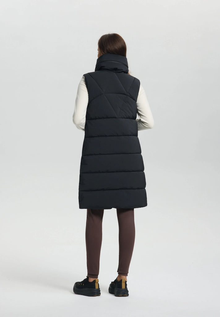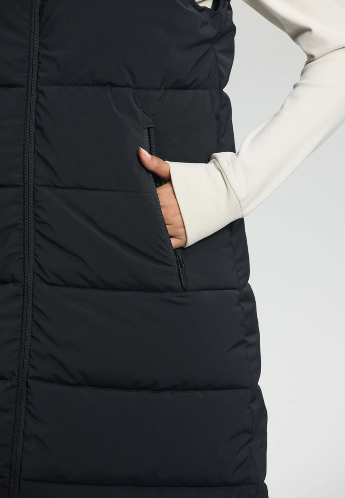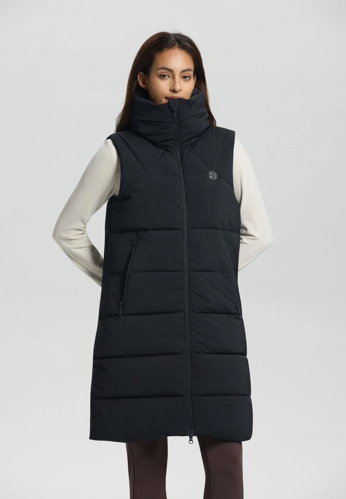 Chaleco LUHTA de imitación de plumón para mujer, de corte clásico u con posibilidad de ponerlo en cuello alto con su solapa contavientos. Sus 2 bolsillos delanteros con cremallera y calientamanos gracias a su forro interior.