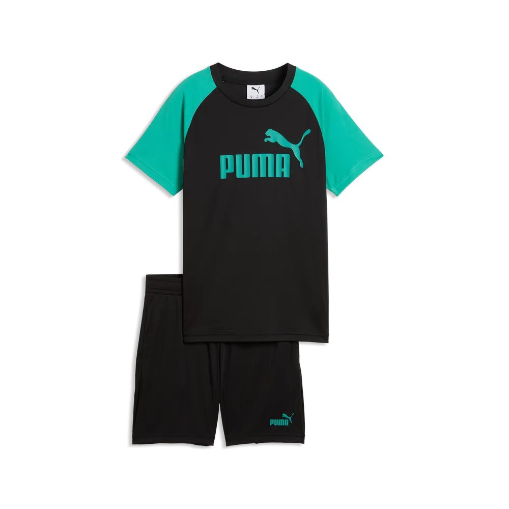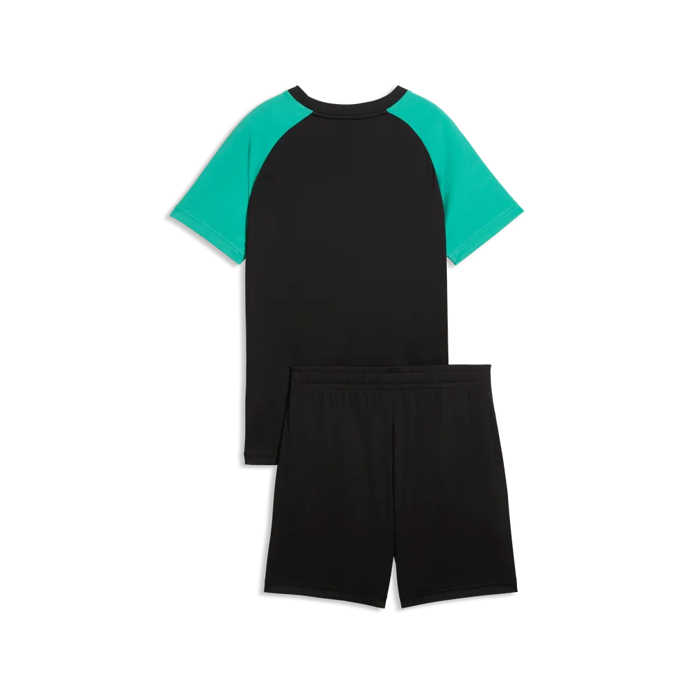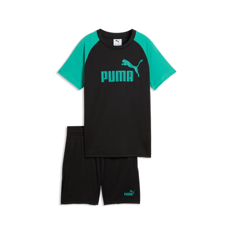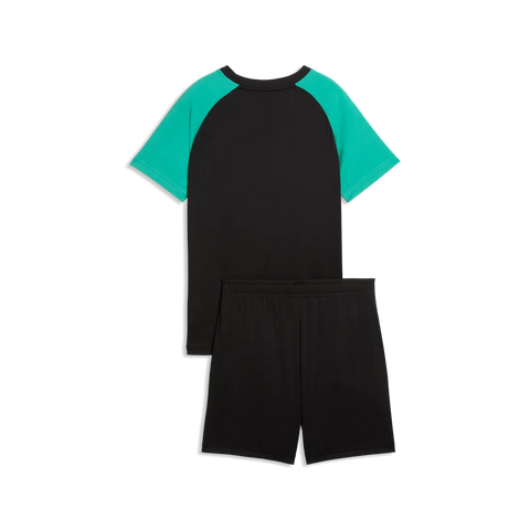 La camiseta combina cuerpo negro con mangas en verde y logo frontal de Puma, aportando un look deportivo moderno. La bermuda, en color negro con detalle de marca, completa un conjunto cómodo y versátil.