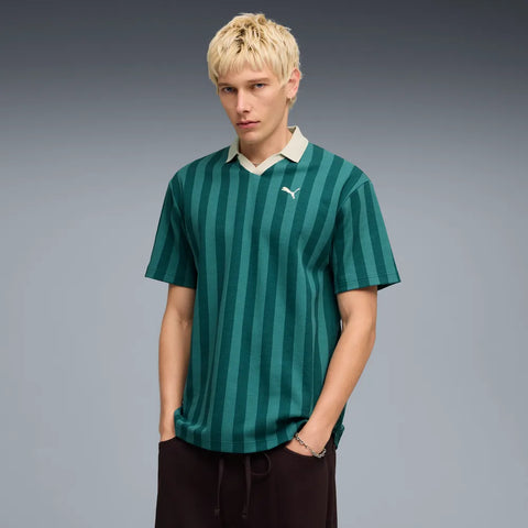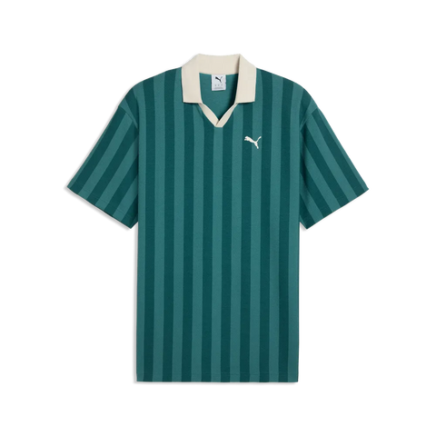 El polo Puma 692069 para hombre destaca por su diseño inspirado en la estética deportiva clásica, con rayas verticales en tonos verde esmeralda que aportan un look moderno y sofisticado.
