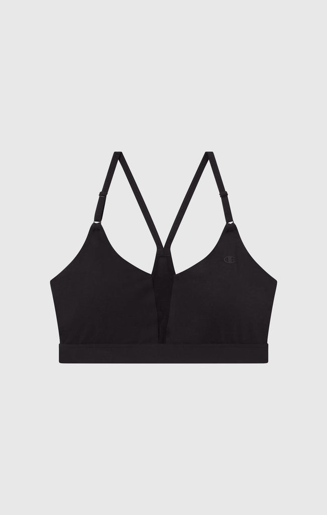 Este sujetador deportivo de CHAMPION está diseñado para acompañarte en cada entrenamiento, combinando rendimiento, soporte y estilo esencial. El tejido interlock stretch de nylon de 200 g/m² se adapta a las formas con suavidad y precisión, ofreciendo una sensación ceñida y cómoda. La estructura sin aros y el corte atlético aseguran libertad de movimiento, mientras que el panel central y las tiras ajustables proporcionan un ajuste estable y personalizado.